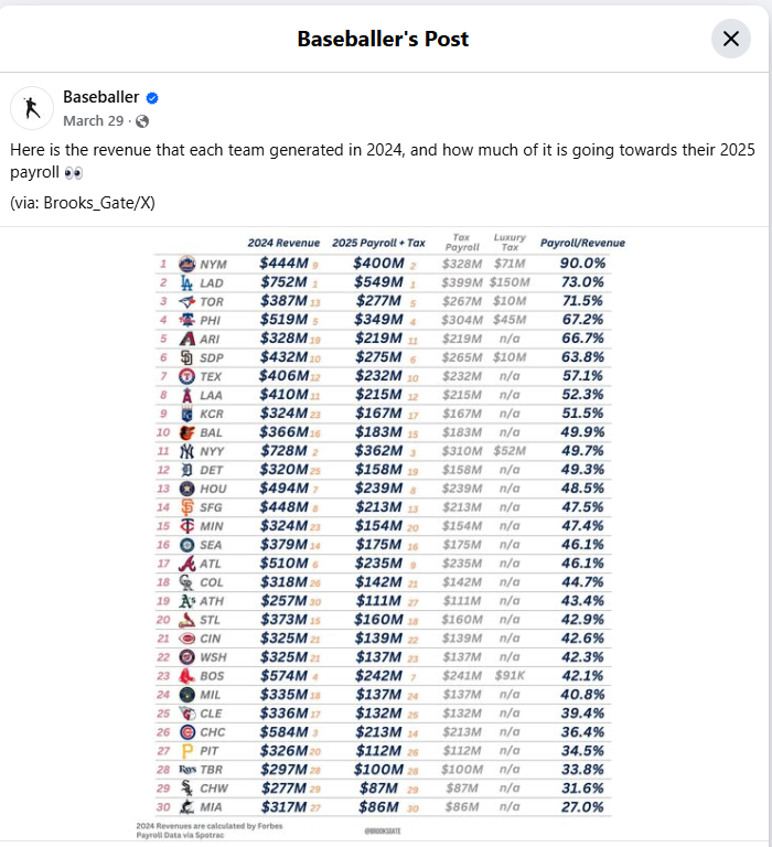 There are certainly issues with the chart, as there’s no real way to get an truly accurate number on revenue — Forbes is making a best effort to estimate. And this only accounts for payroll spending that is publicly available. Spending on all other baseball activities (and there are a lot) are not included.