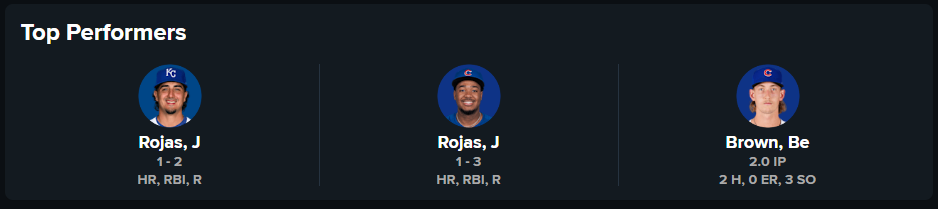 - Jefferson Rojas had another great game, and I thought he was so good, he may have been a Top Performer for both teams. Alas, the other J. Rojas was Josh Rojas, who played third for the Royals. Rojas (the Cub version) definitely is showing why he’s such a highly regarded prospect — possibly the heir apparent to Dansby Swanson.