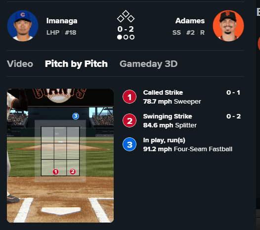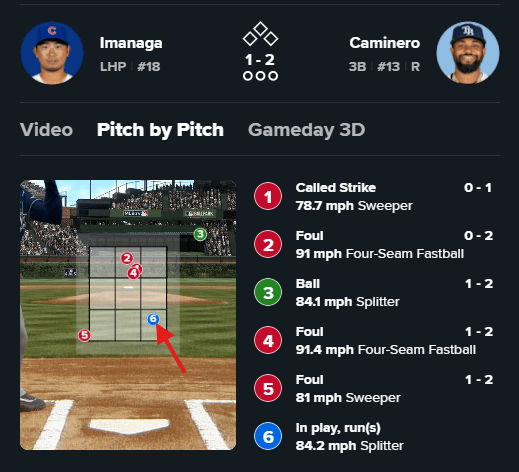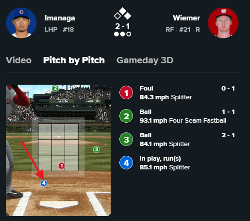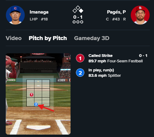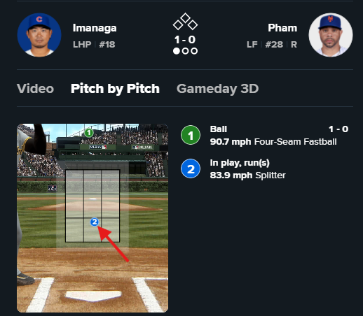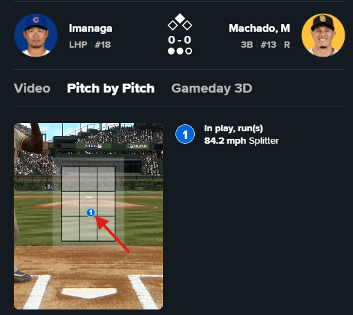 Low and away splitter, good hitting. Verdict: Splitter – Not Mistake