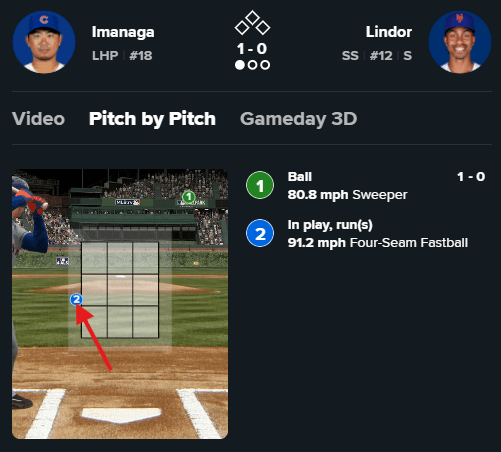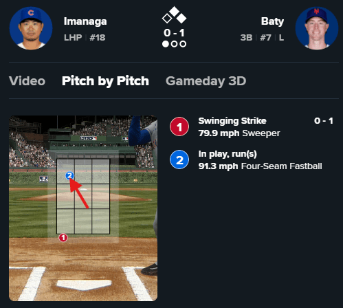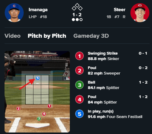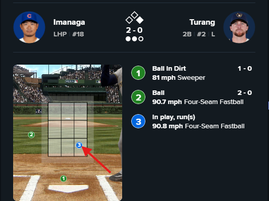 High fastball in a decent spot. Only 91 mph, but that was normal for Imanaga in the 2nd half of 2025. Verdict: Fastball – Not Mistake