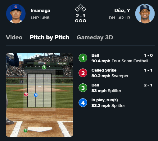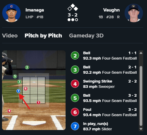 One of the odder pitches that Imanaga allowed for a home run, but also the most painful. The pitch before was an obvious mistake, which might have been why he decided to go with the slider. He got Vaughn to swing at a rare sweeper low an in earlier in the at bat, so maybe he was trying to do the same thing. He got the chase, but the pitch was just too high. Verdict: Slider – Mistake