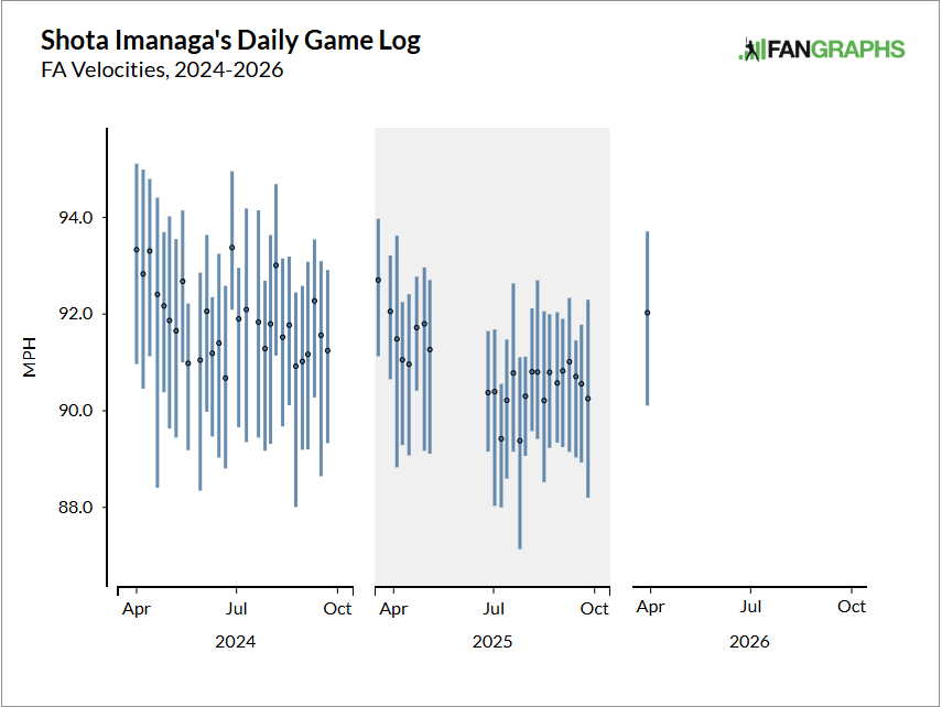 I did extensive looks at Imanaga in a few previous posts, including looking at his fall-off post-injury in 2025: